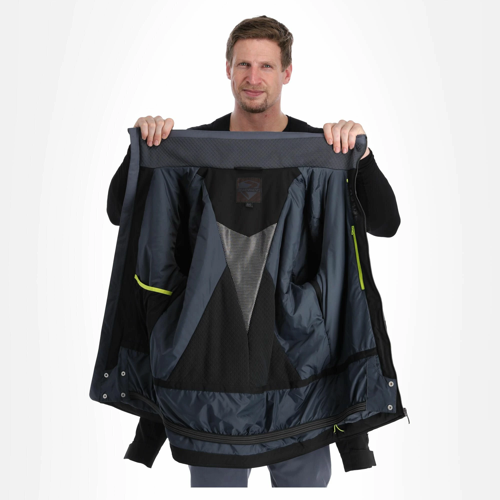 The functional, padded ZIENER men’s ski jacket TARPU MAN is ideally suited for long skiing days in any weather thanks to its high-quality, elastic outer material. The breathable, waterproof and windproof ZIENER AQUASHIELD® membrane keeps you warm and dry. The jacket is PFC-free thanks to its environmentally friendly waterproofing. Moreover, the insulation made of breathable and lightweight insulating material keeps the heat balance even when wet – for a particularly high wearing comfort. Technical details contribute to this ski jacket’s high level of functional comfort. The forearm vents provide the necessary ventilation. Numerous features such as pockets for ski goggles and sunglasses as well as for smartphones, a side ski pass pocket, and a zippered breast pocket make this jacket an absolute highlight on the slopes.